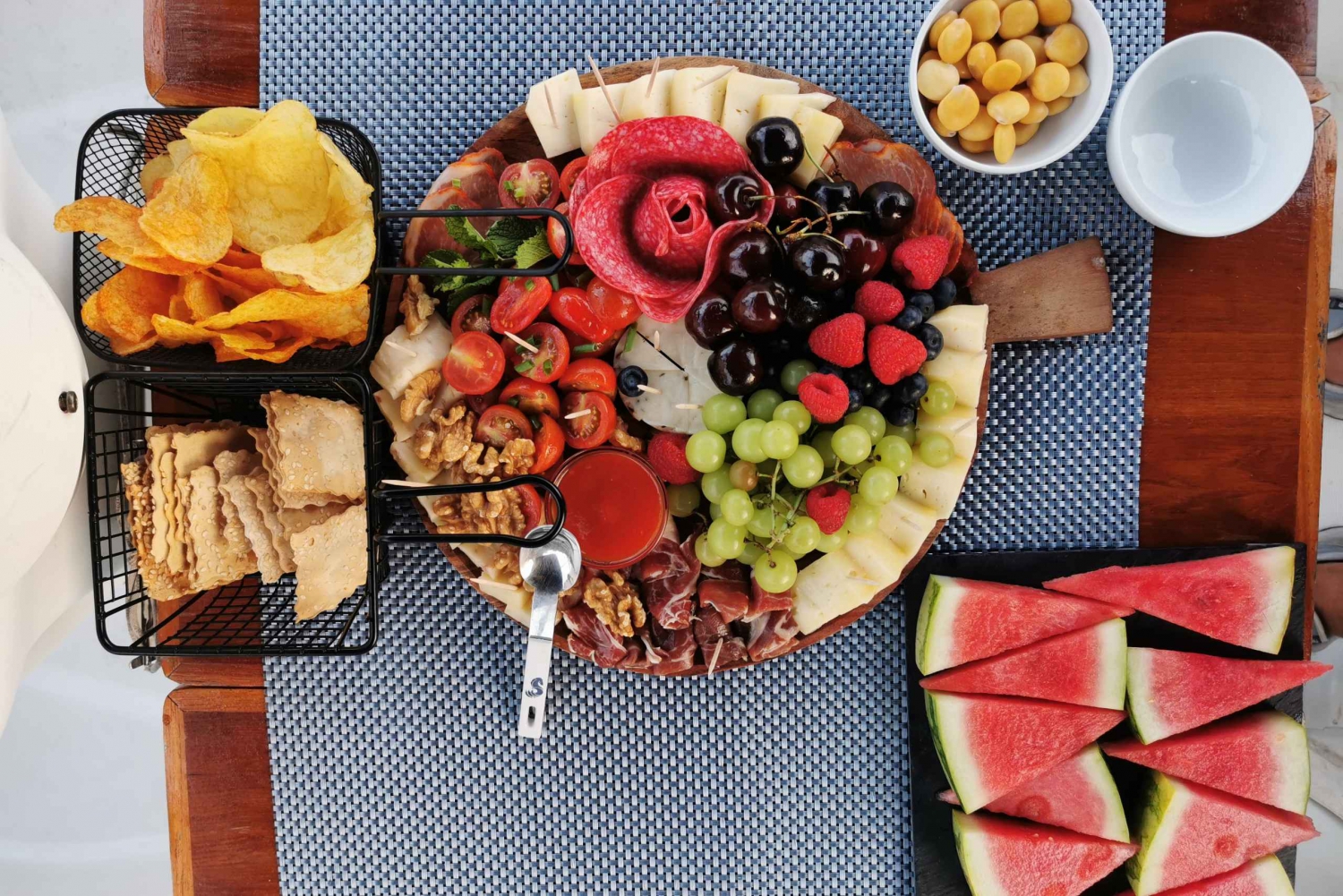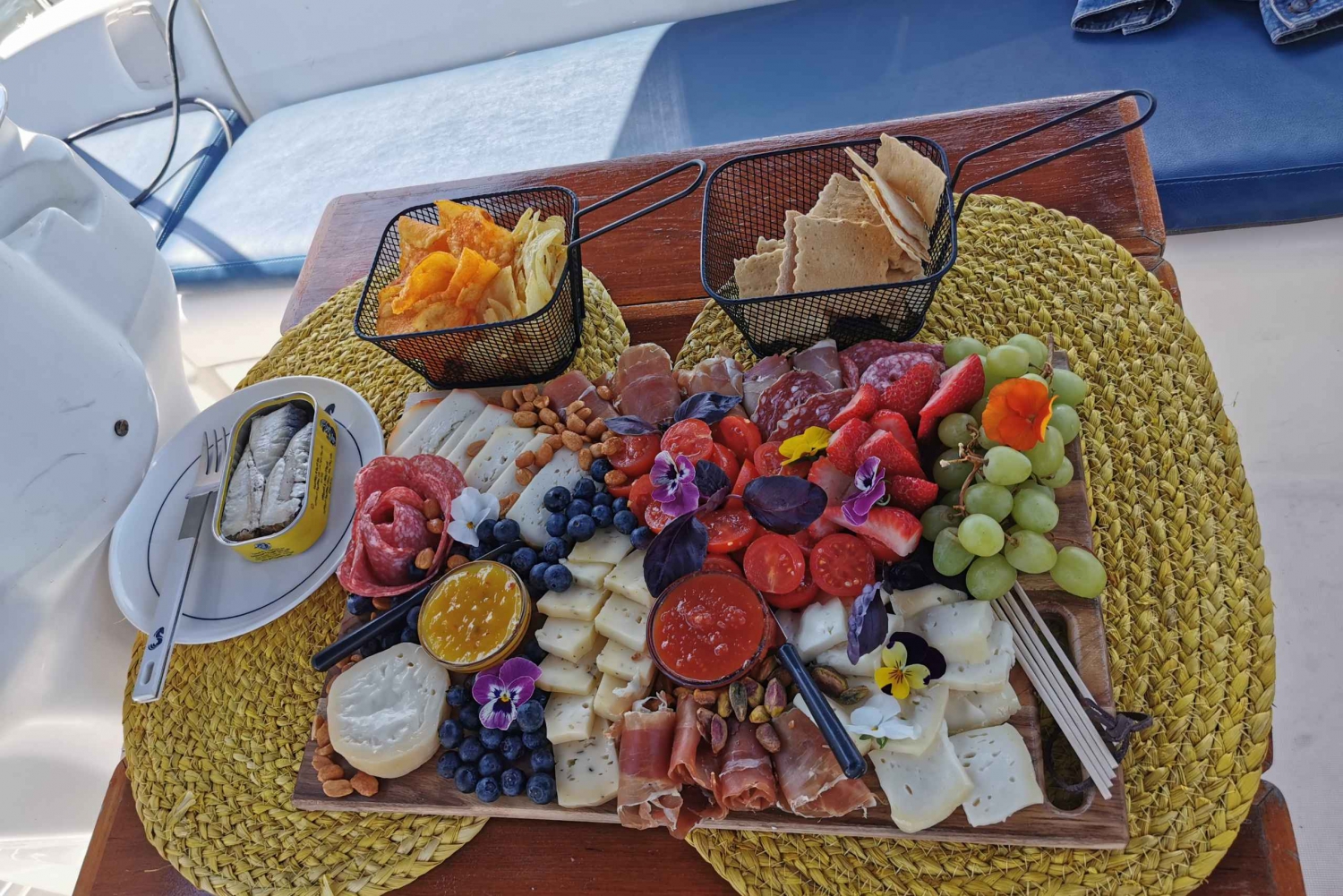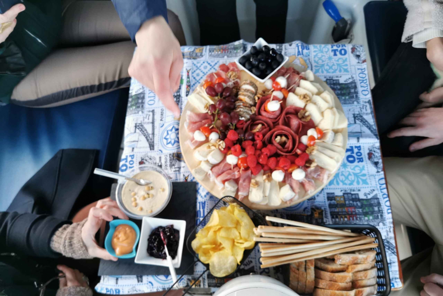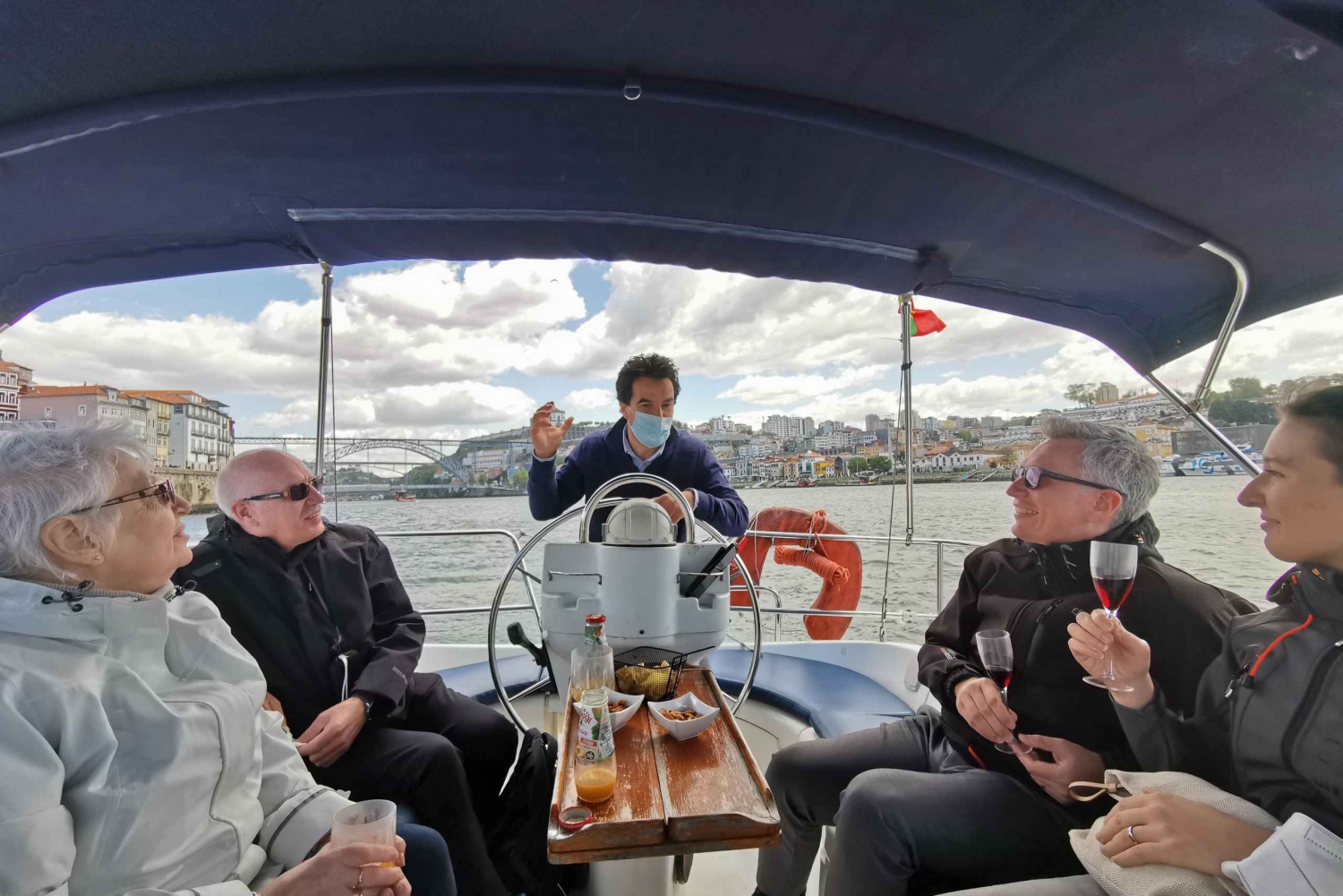 Passando a Ponte da Arrábida, começamos por servir o primeiro vinho à sua escolha e preferência. Chegados à Ponte D. Luiz I, servimos uma tábua de degustação com queijos de qualidade superior, charcutaria, compotas e chutneys variados, fruta fresca, bolachas gourmet, frutos secos, entre outros sabores que podemos provar como azeitonas em azeite, ou chouriço assado … E ao longo do rio ondulante e apreciando tranquilamente as suas margens ao som de boa música, rumamos para o mar. Podemos, caso os nossos clientes assim o desejem, trocar o vinho por outro da sua preferência, e finalizamos com vinhos do Porto Ruby, branco e tawny para que lhe traga uma sensação completa de sabores.